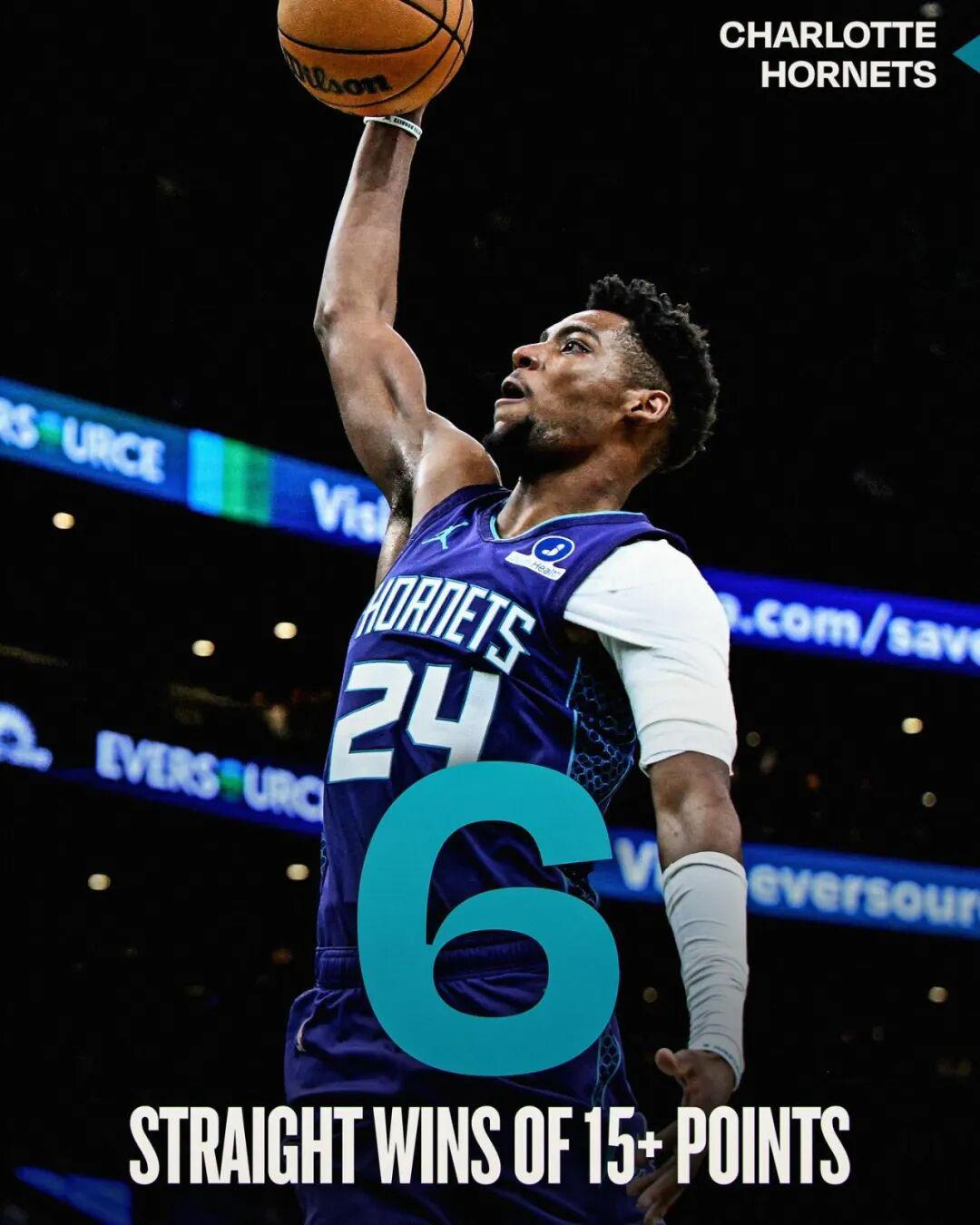 再加上本场大胜凯尔特人29分,黄蜂本赛季已经连续击败了过去三届NBA总冠军,且每场比赛都至少赢了20分。